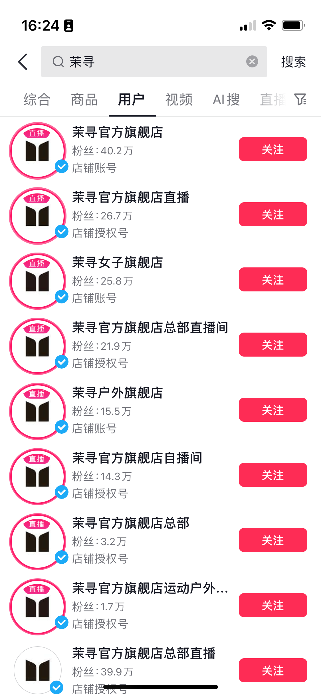 茉寻、小野和子等品牌旗舰店直播间每天直播时长高达10多个小时,甚至接近20小时,几乎一天之中的任何时间搜索品牌,都能找到正在直播的账号。不仅如此,这些品牌都有旗舰店、女装旗舰店、服饰旗舰店等数个官方账号,茉寻的官方账号更是多达14个,同一时间有六七个账号同时直播,维持直播时长。