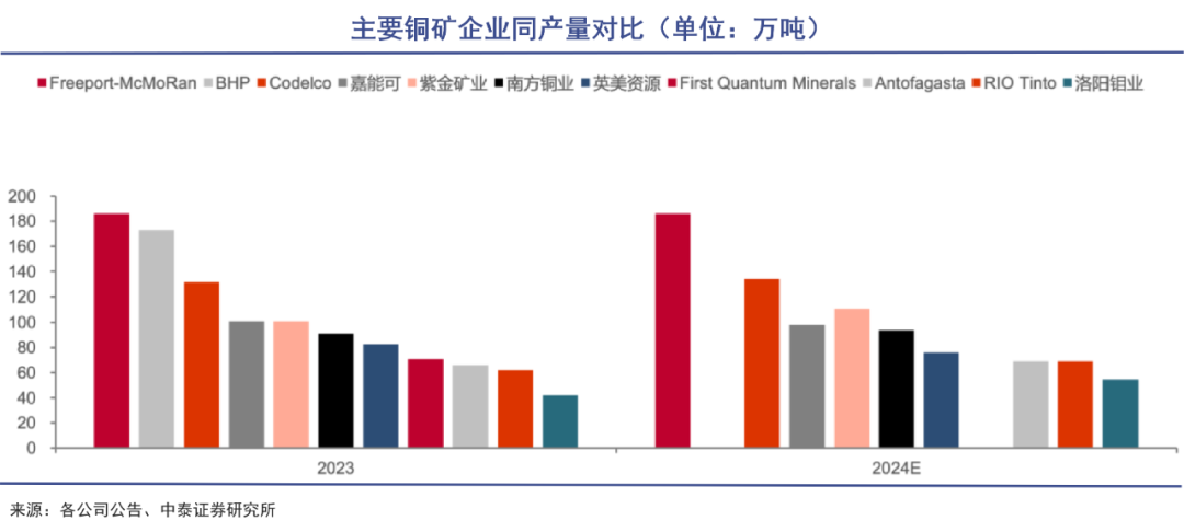 2023年,公司产铜41.95万吨,钴5.55万吨,同比分别增长51%和174%,铜产量接近全球前十,并超越嘉能可,成为全球第一大钴生产商,钼、钨、铌产量在全球保持领先。