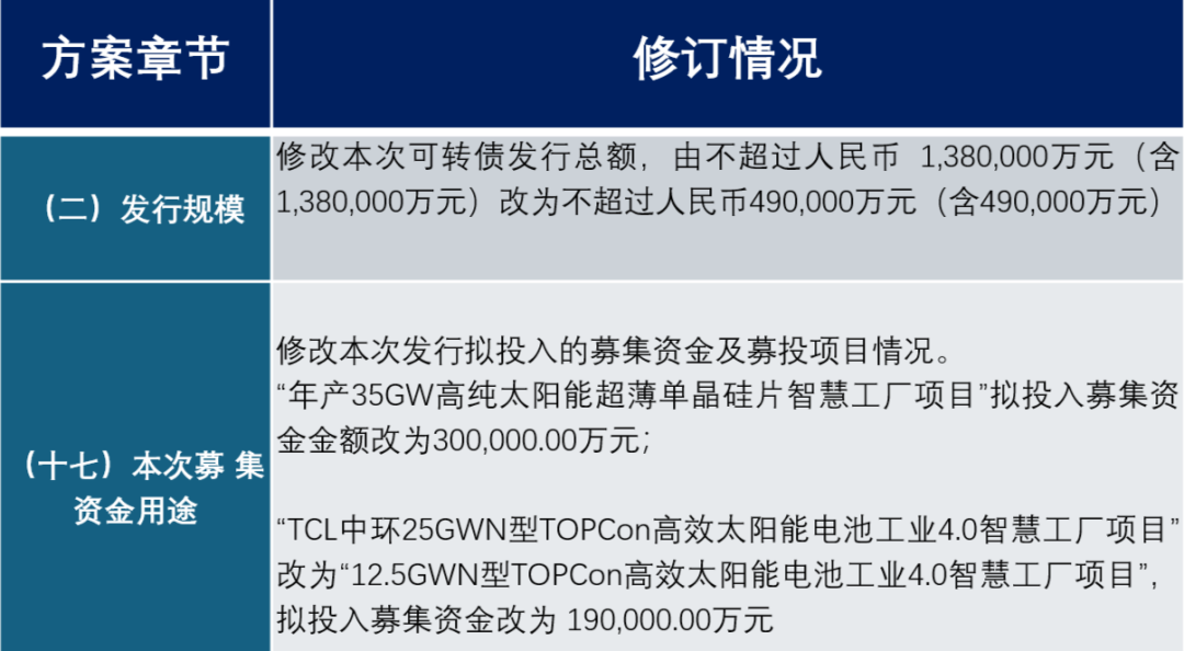 5月24日,TCL中环同时更新了可转债发行方案《TCL 中环新能源科技股份有限公司关于向不特定对象发行可转换公司债券募集资金运用的可行性分析报告(修订稿)》、《TCL中环新能源科技股份有限公司向不特定对象发行可转换公司债券发行方案的论证分析报告(修订稿)》等文件。