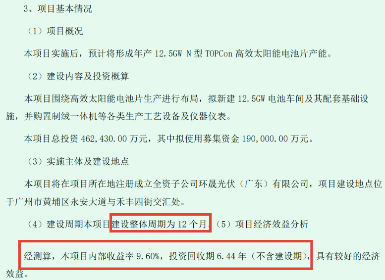 仍以广州电池项目为例,“该项目围绕高效太阳能电池片生产进行布局,拟新建12.5GW电池车间及其配套基础设施,并购置制绒一体机等各类生产工艺设备及仪器仪表。该项目总投资462,430.00万元,其中拟使用募集资金190,000.00万元”。