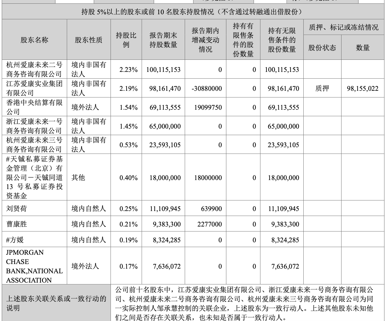 本次增持前,爱康实业持有爱康科技0.98亿股,持股比例为2.19%;爱康实业及其一致行动人浙江爱康未来一号商务咨询有限公司、杭州爱康未来二号商务咨询有限公司、杭州爱康未来三号商务咨询有限公司合计持有爱康科技2.87亿股,占其总股本的6.4%。