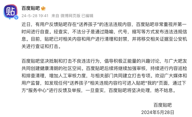 5月28日晚间,@百度贴吧 发文称,近日,有用户反馈贴吧存在“送养孩子”的违法违规内容,百度贴吧非常重视并第一时间进行自查。经查实,不法分子是通过隐喻,代号,缩写等方式发布违法违规信息。目前,贴吧已对相关内容和用户进行清理和封禁,并将移交相关证据至公安机关进行查证和打击。百度贴吧后续将继续加强审核,持续进行内容巡检和排查清理,增加人工审核力度,与相关部门共同建立打击专项。