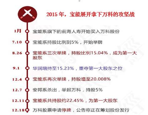 2015年,宝能系全方位展开对万科股份的狙击,1月,宝能集团控股的前海人寿开始在二级市场买入万科股份;7月,前海人寿耗资79.45亿买入万科股份5.53亿股,持股比例达到5%,开始举牌。