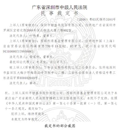 2016年9月,深圳中院做出驳回上诉,维持原裁定的终审裁定,确定了罗湖区法院的审理权。这一裁定于2016年11月公告,不知为何却在近日被媒体“翻炒”为实体判决,导致了假新闻事件的发生。至此,万科工会起诉钜盛华等损害股东利益纠纷案尚未审结,宝万之争仍无定论。