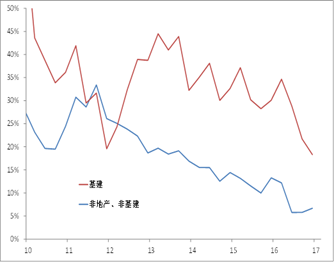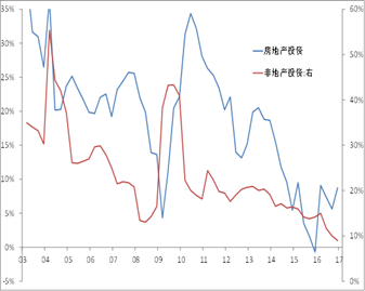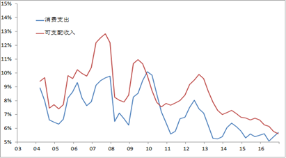 2016年中国经济主要靠基建投资与房地产投资来维稳,估计2017年的基建投资增速和房地产投资增速都会有所回落。当然回落幅度应该不会过大,因为去年批下来的一大批PPP的项目还会继续拉动基建投资增长,包括去年房地产的销量大幅增加之后,它对去年偏低的房地产投资增速还有一定的推升作用,这是惯性使然,或称之为“无动力滑翔”。估计今年上半年的投资增速依然还是维持在一个相对高的水平,包括民间投资增速也可能继续上行,但惯性过后,下半年投资增速或会有所回落。如房地产销量的持续回落,最终也会带来房地产投资增速的回落;而基建投资的长期低回报是不可持续的。