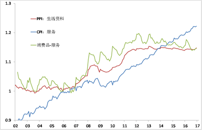 如果把CPI划分为消费用品和服务,那么,从2012年至今,剔除服务因素的消费物品并没有涨价,这几年的基本趋势是走平,而服务价格的攀升更为显著,反映了货币供应膨胀背景下的人工、房租、流通等成本提升。这其中货币超发的影响固然不可低估,但不可贸易部门对货币的过度吸纳是更为重要的原因。在可贸易部门,原料成本与成品价格都要被动接受国际定价,套利空间不充分,那么货币超发主要进入非可贸易部门并推动价格飙升,也就是说大量的资金还是集中在资本领域,而没有在消费品领域。