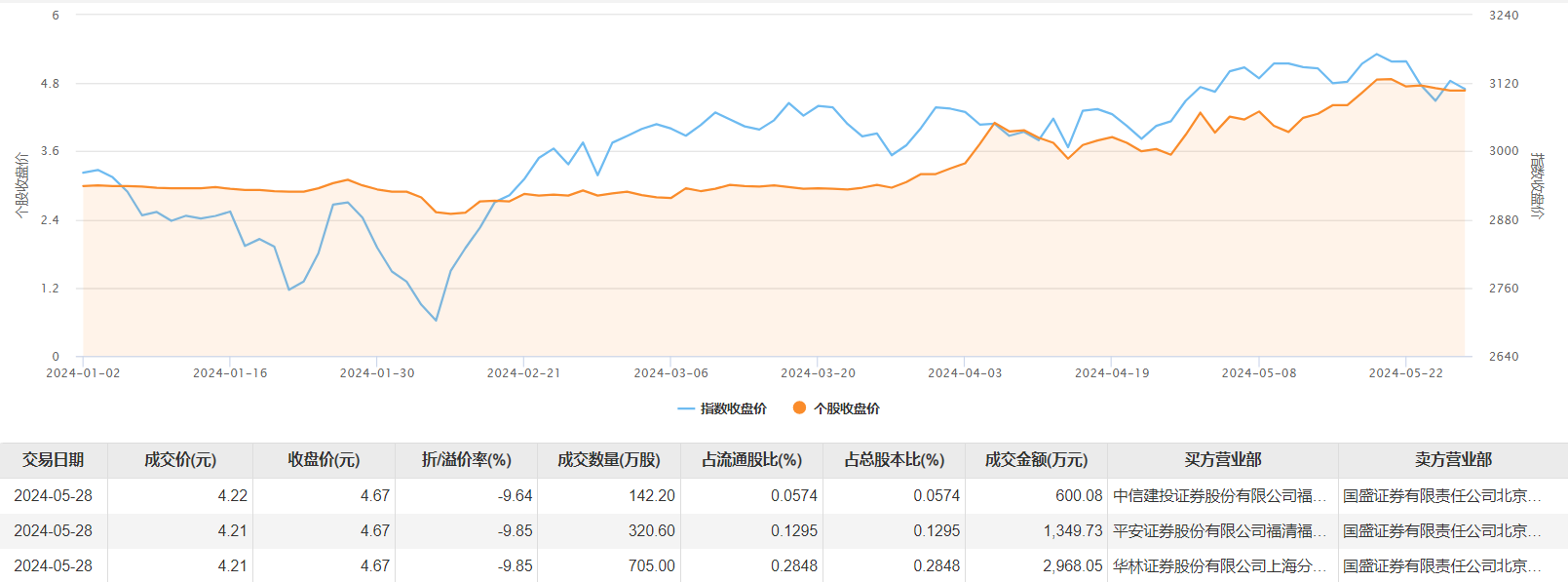 大名城5月28日大宗交易成交1167.8万股,成交额4917.86万元,占当日总成交额的24.32%,成交均价4.21元,较市场收盘价4.67元折价9.85%,其中最高成交价4.22元,最低成交价4.21元。