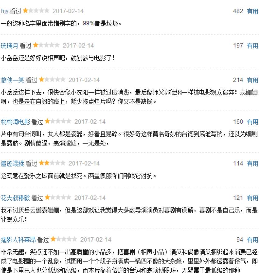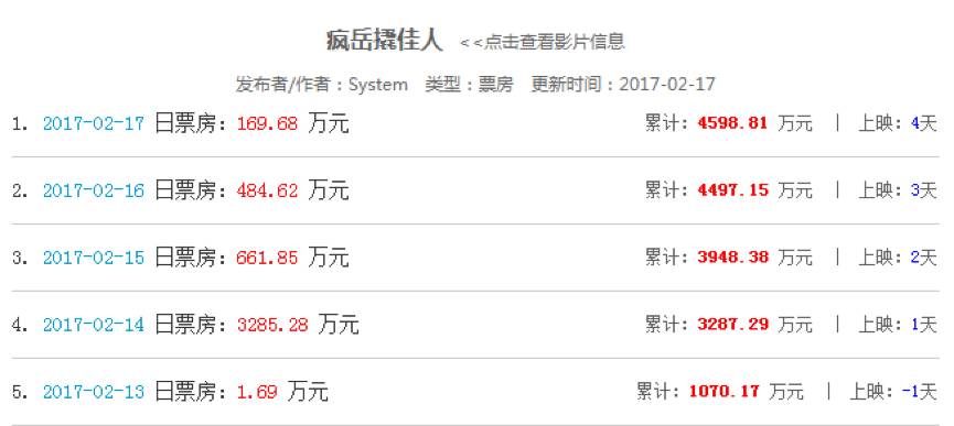 《疯岳撬佳人》目前在豆瓣的评分仅为3.5分,有近两千人参与,而60%的观众仅给了一星评价,其中一位网友“一般这种名字里面带错别字的,99%都是垃圾”的影评收到四百多个赞,成为这部影片最“经典”的诠释。而再观其尴尬的票房成绩,扑街的姿势或早已定格。截止2月17日,其已上映4天,累计票房为4515万,尚不及同期上映的《爱乐之城》首映一天的票房。