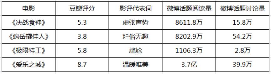 为了更明显的显示国内影片和国外影片的差距,就目前上映的影片,读娱君选了具有代表性的四部,统计了其在豆瓣,微博指数的段位表现,得到两个结论: