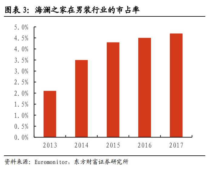 2003年以来,海澜之家接连签下吴大维、印小天、杜淳等当红明星,并针对电视媒体大手笔投放聚焦男性消费者的广告,一跃成为中国男装品牌翘楚。东方财富披露的数据显示,2014年,在中国男装市场,海澜之家的份额为3.5%,位列第一。