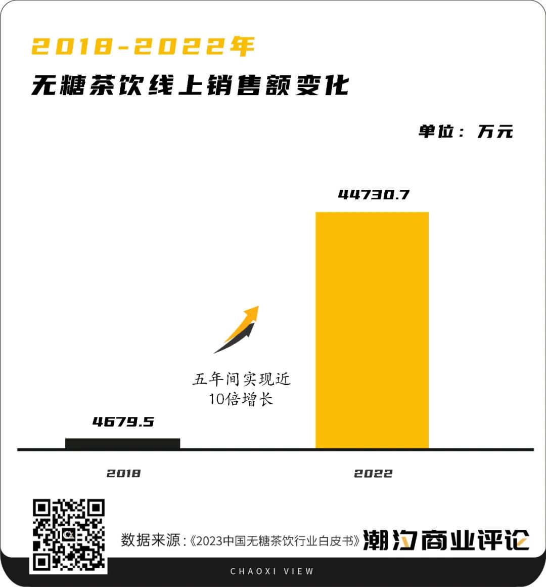 据亿欧智库发布的《2023中国无糖茶饮行业白皮书》,通过分析天猫淘宝平台近五年的无糖茶饮料销售额发现,无糖茶饮在线上的销售额从2018年的4679.5万元,到2022年达到44730.7万元,五年间实现了近10倍的增长。