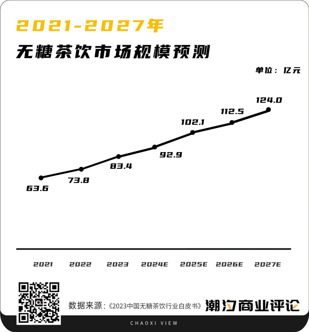 Euromonitor数据显示,预计到2027年,中国无糖茶饮市场规模将达到124亿元,未来五年,中国茶饮市场将进入无糖茶饮高速增长期。
