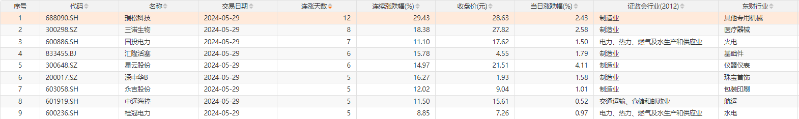 5月29日消息,Choice数据统计,A股今日1只个股连续12天上涨,为瑞松科技;1只个股连续8天上涨,为三诺生物;此外,国投电力连续7天上涨;汇隆活塞、星云股份2只个股连续6天上涨。