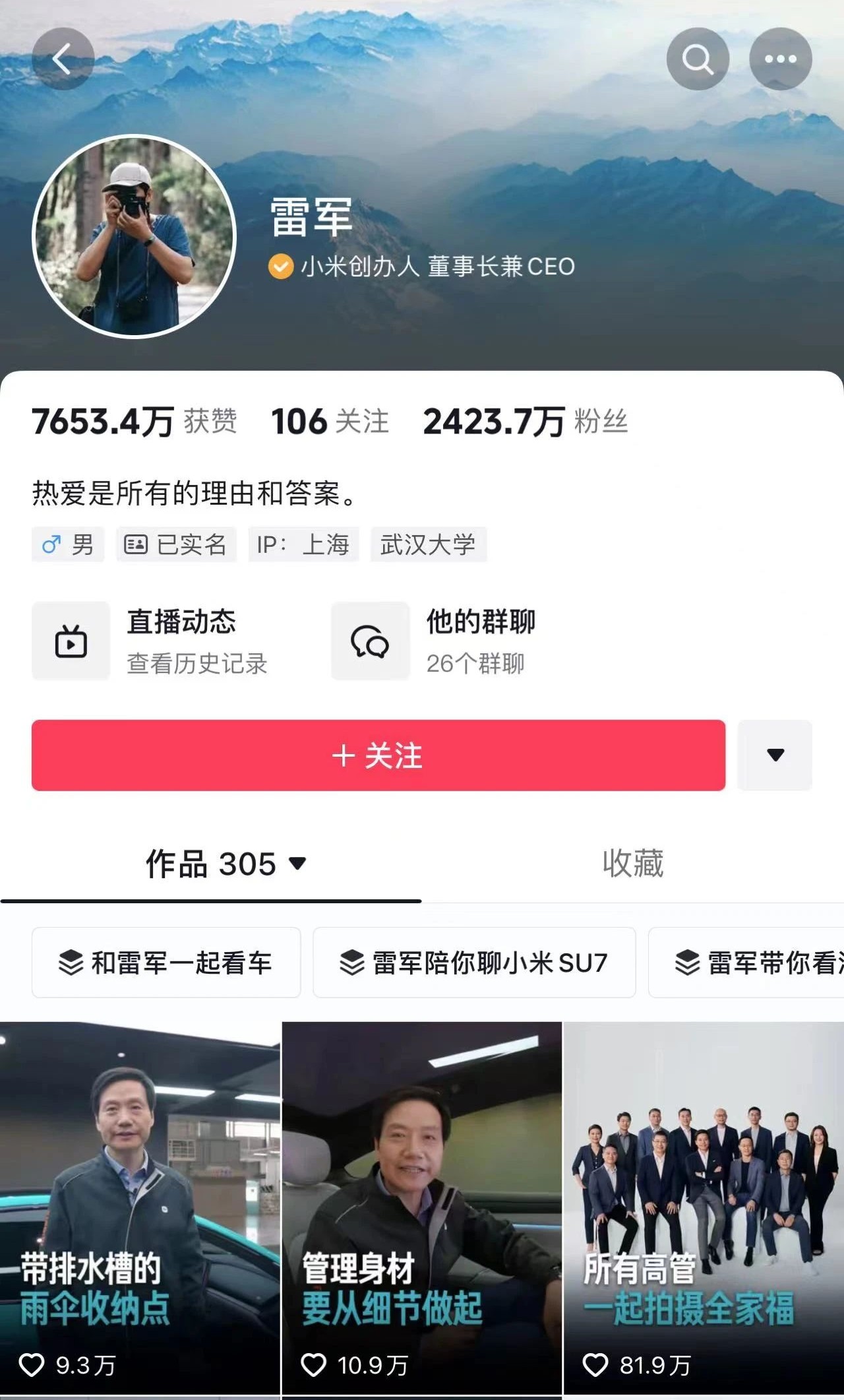 多位小米车主表示,他们是冲着雷军而买的车。镜观台了解到,雷军个人仅在抖音的粉丝已超过2400万人。