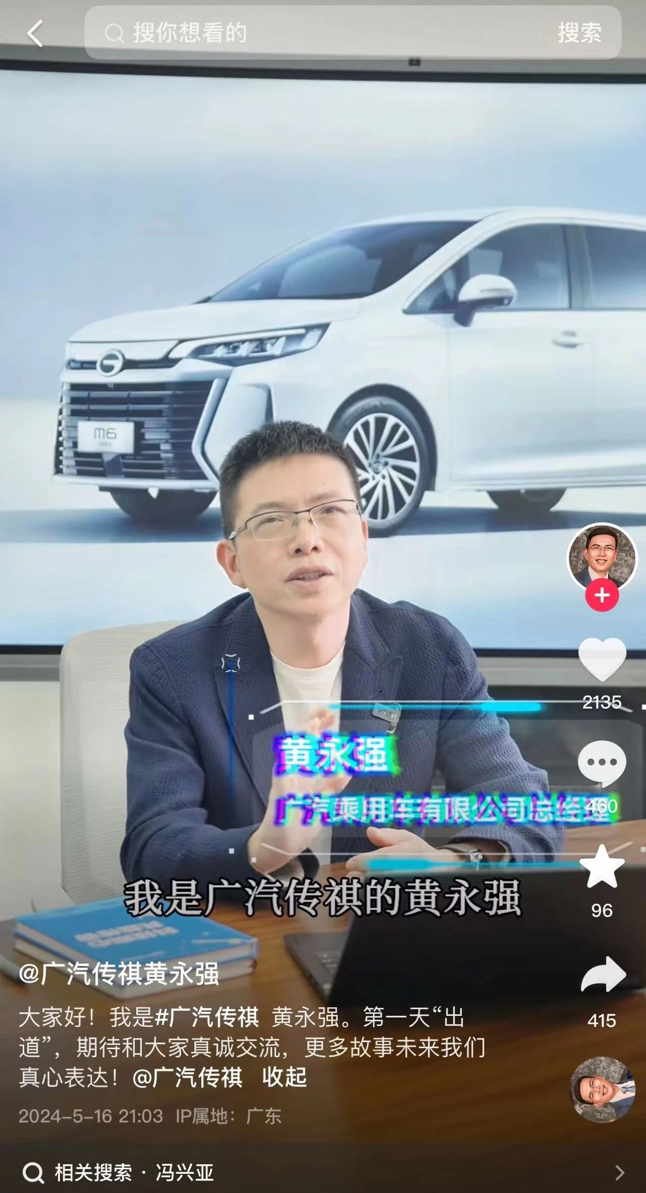 所以,广汽埃安总经理古惠南、广汽传祺总经理黄永强等近期也开通了个人视频号。对于从幕后走到台前,黄永强表示,希望能听到大家真实的、直接的声音,更希望和大家多多交流,为大家做好服务。