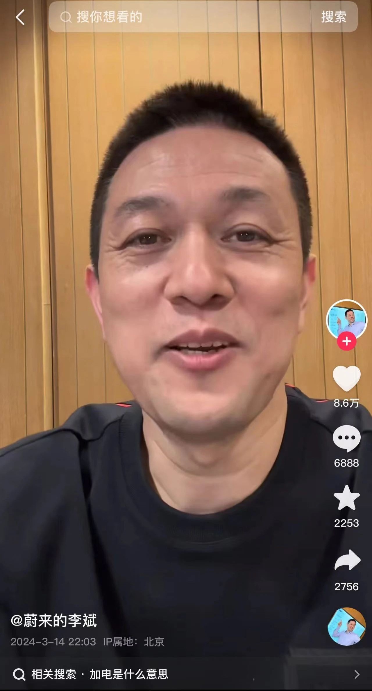 3月14日,李斌又开启了他个人抖音号的第一次直播,积极回复网友的问题,讲解蔚来的产品和理念,甚至还让妻子出镜回应几年前的“翻车”事件,收获了无数网友的点赞,当然还有打赏。