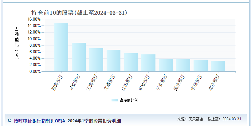 其中,招商中证银行AH价格优选ETF发起式联接A,今年以来涨幅22.55%。博时中证银行指数(LOF)A,规模5.21亿,今年以来上涨19.93%,前10重仓股占比62.28%,持仓第一的招商银行占比高达14.7%。
