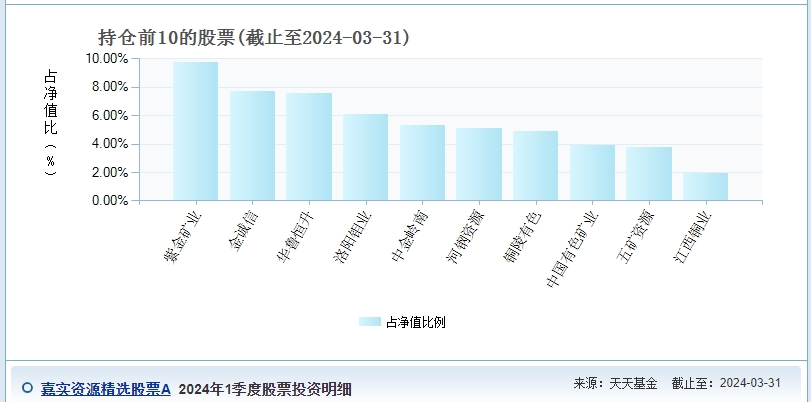 其中,嘉实资源精选股票A,规模4.27亿元,今年以来上涨27.31%,重仓黄金、煤炭、石油等资源类周期股,一季度末,第一大权重股紫金矿业占比9.77%。