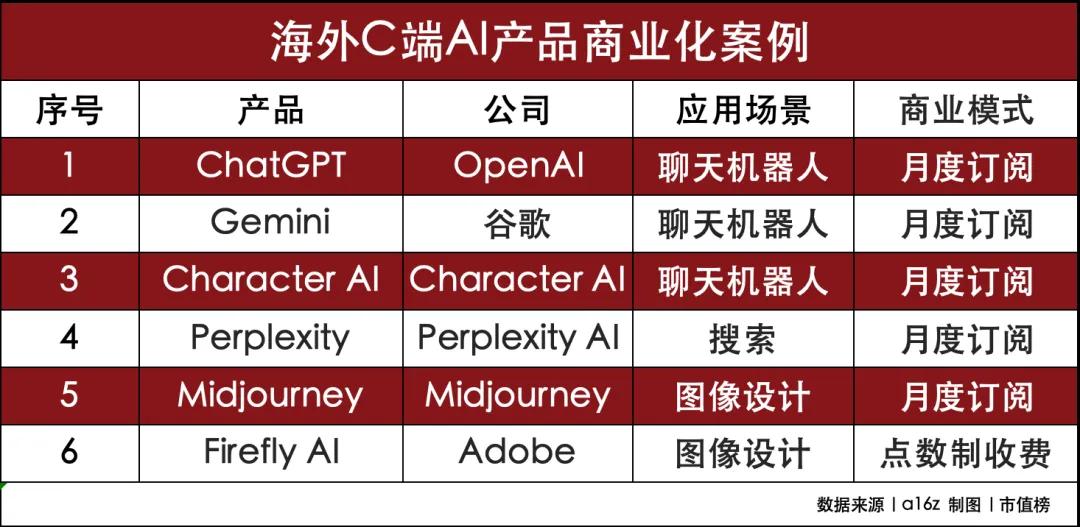 今年3月,美国风险投资机构a16z发布的报告显示,排名前三的都是AI聊天机器人,ChatGPT仍是C端应用顶流,机构预计今年ChatGPT的收入是10亿美元。