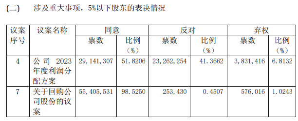 - 仅有回购公司股份方案这一小股东提出的议案未获审核通过,结果显示:49.1%投票同意、0.2246%投票反对、50.6751%投票弃权,其中98.525%的持股5%以下股东投票同意。