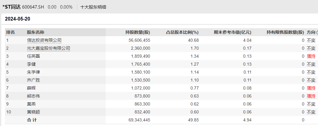 Wind数据显示,2023年12月31日,*ST同达股东户数较同年10月20日增长459户至8383户。截至2024年3月31日,该公司仍有7456户股东;其中第一大股东信达投资持股比40.68%,第二大股东光大嘉宝持股1.7%,其余位列十大股东的均为自然人股东。