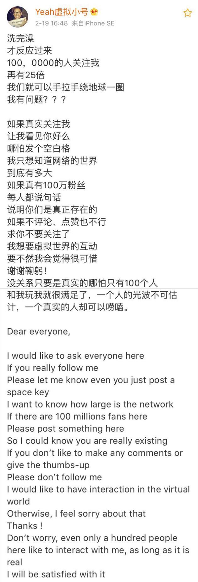 近日,郑爽开通了微博小号后,因激烈言论久居热搜榜。2月19日,郑爽微博小号粉丝突破一百万,她发博请求:“再有25倍,我们就可以手拉手绕地球一圈,我有问题?”同时她也希望关注她的人都能说句话,证明是真正存在的。