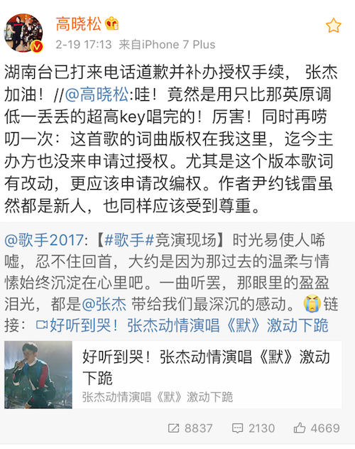 2月19日下午,高晓松再次转发微博,透露进展,“湖南台已打来电话道歉并补办授权手续, 张杰加油!”