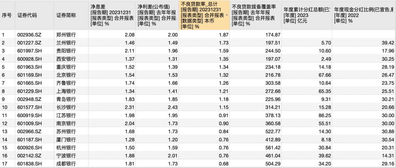 截至2024年一季度末,17家A股上市城商行中,不良贷款率在1.5%以上的城商行有三家,分别为贵阳银行、兰州银行和郑州银行;不良贷款率在1%以下的城商行有7家,分别为成都银行、厦门银行、杭州银行、宁波银行、南京银行、苏州银行和江苏银行。