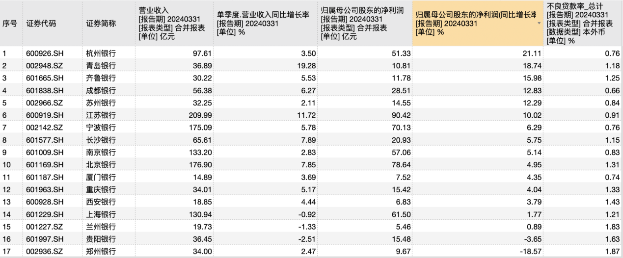 17家城商行2024年一季度财报数据,来源:Wind