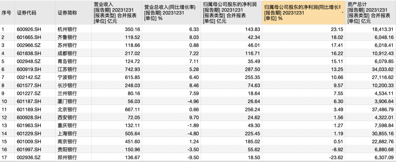 17家城商行2023年财报数据,来源:Wind