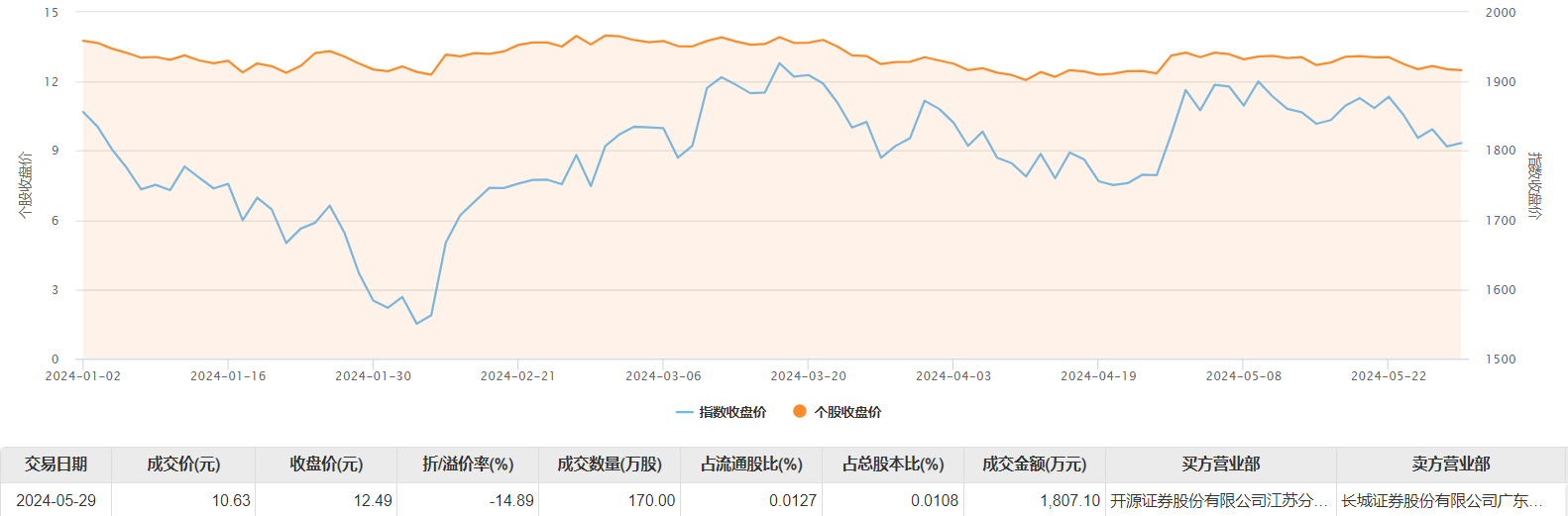 东方财富5月29日大宗交易成交170万股,成交额1807.1万元,占当日总成交额的1.71%,成交价10.63元,较市场收盘价12.49元折价14.89%。