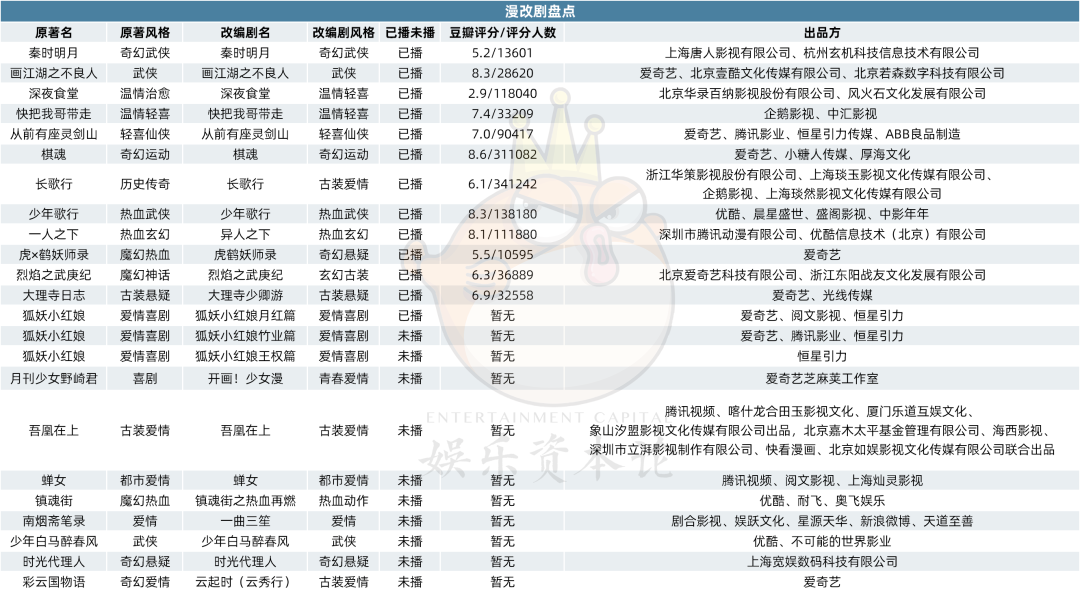 女频漫改剧改编难度相对较小,例如《长歌行》、《狐妖小红娘月红篇》,可以对标古偶、仙偶进行制作。