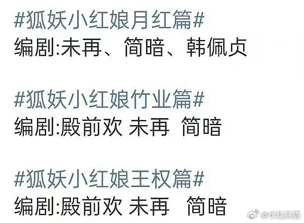 《月红篇》的编剧为未再、简暗和韩佩贞,其中未再是“首次”参与到这样的古装大IP中,此前他的代表作主要是《怪你过分美丽》《我要逆风去》,不过“狐妖三部曲”中都有他的身影。韩佩贞的代表作是《醉玲珑》《天乩之白蛇传说》《听雪楼》。后两部剧的编剧还有谬文静,她的代表作是《媚者无疆》《七时吉祥》。