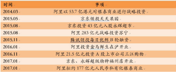 新零售的探索不止于此,早在2014年3月,阿里就入股银泰商业进行战略投资,2017年1月又拟将银泰商业私有化。同时,京东与永辉、天天果园,腾讯与每日优鲜的合作也都融合了线上线下元素,颠覆传统电商运营模式。