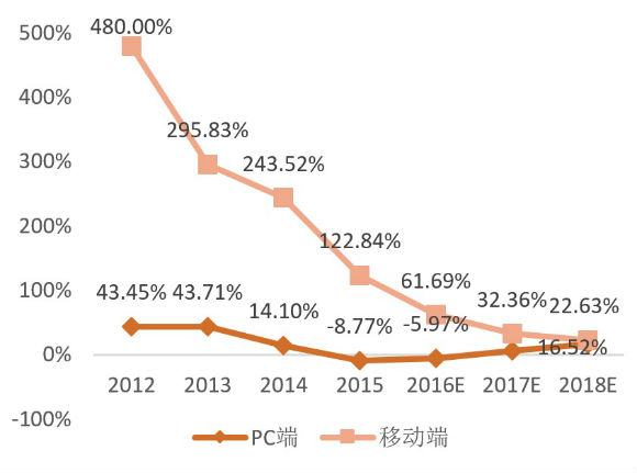 经历了早前粗放式增长,流量电商红利期已成过去时。数据显示PC端与移动端网购增速均显著放缓,预计2018年PC端、移动端增速将从2012年480%、43%的超高速增长降至23%、17%。