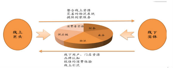 线下通过品牌背书、售后服务、门店仓储,极佳的消费体验向线上引流;线上平台价值、物流先发优势及供应链整合能力也将不断革新线下消费。