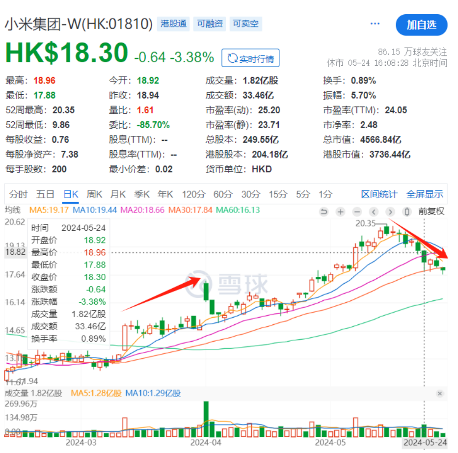 财报后,小米股价累跌7.32%,29日的收盘价为18.3港元/股,市值4566.84亿港元。