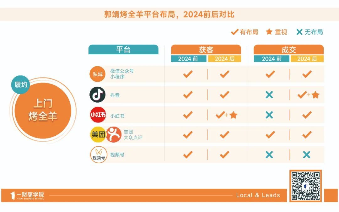 2024年之前,郭靖烤全羊在私域、抖音、小红书、美团、大众点评、视频号全域布局官方账号,做品牌建设,通过官方账号内容、达人合作引流获客,将客户引导到私域微信公众号+小程序成交下单。2024年上半年开始,开始重视抖音交易闭环搭建,小红书内容获客环节。