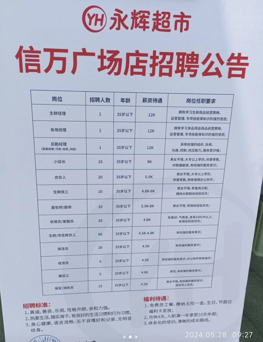 目前,永辉超市信万广场店也开启了对外招聘。此次调改中,也包括提高员工薪酬、减少工时、增加休假。而该店正在招聘的职位包括生鲜经理、小店长、合伙人、面包师、搬运工、保洁员等13个工种员工,薪资待遇在4500至12000元之间。