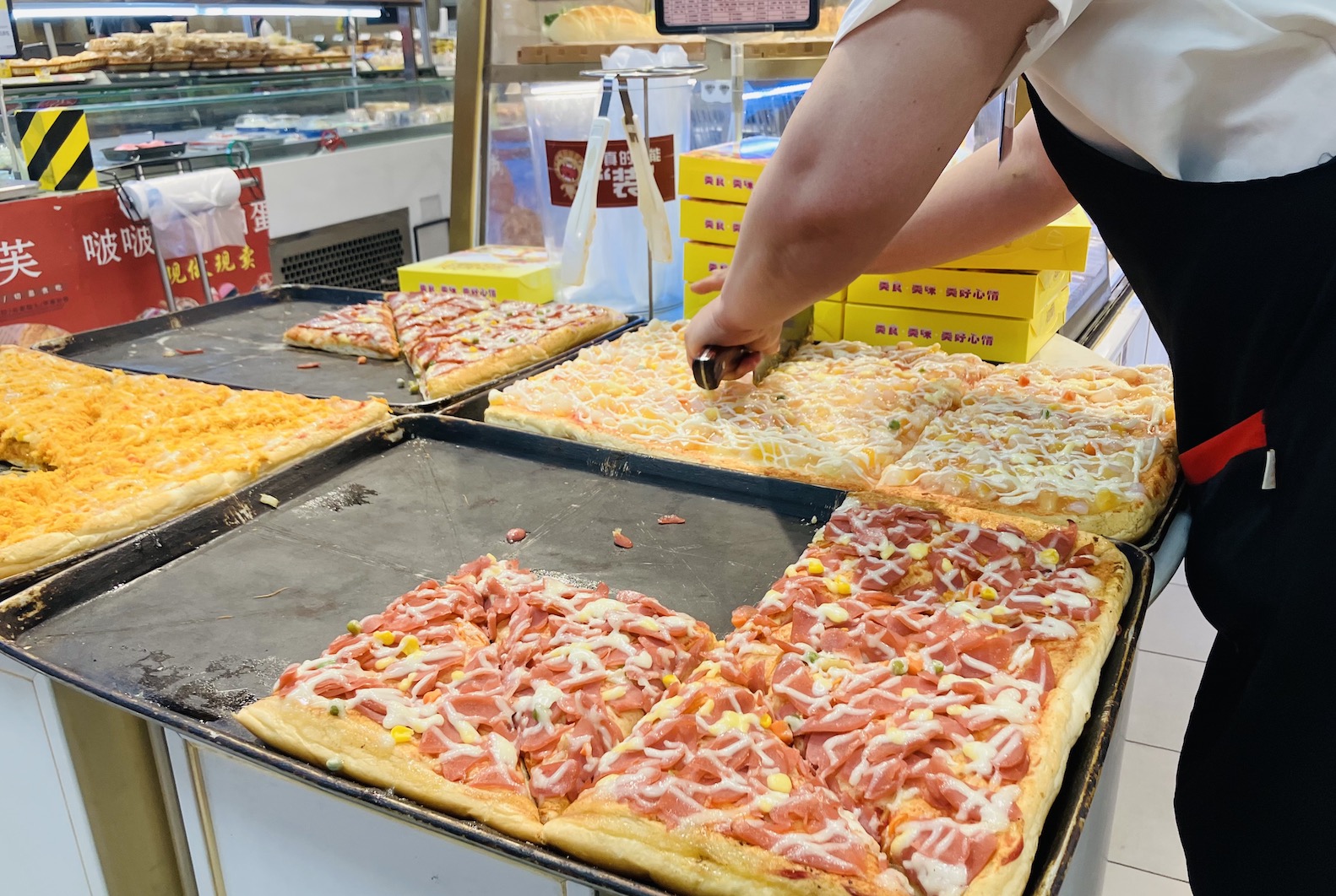 界面新闻走访永辉超市新乡宝龙广场店时看到,这家店是永辉标准的大卖场门店,分上下两层,涵盖日用百货、饮料、生鲜水果、肉品海鲜等品类,得益于新乡整体零售大环境影响,永辉宝龙广场店整洁干净,熟食区域同样通过档口提供服务,并写上投诉电话以便得到顾客反馈,在烘焙区域,还有正在出炉的披萨,但与人潮拥挤的新乡胖东来两家店对比,永辉这家门店客流稀少。