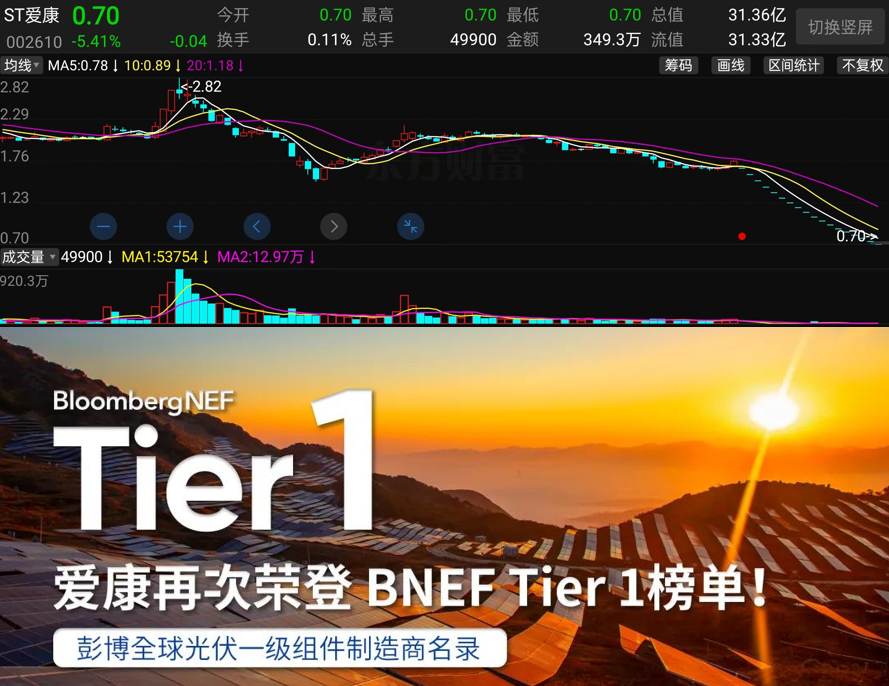 5月29日,ST爱康继续跌停,报收0.7元。至此,ST爱康已经连续8个交易日股价低于1元。按照规定,连续二十个交易日的股票收盘价均低于1元,交易所将终止其股票上市交易。