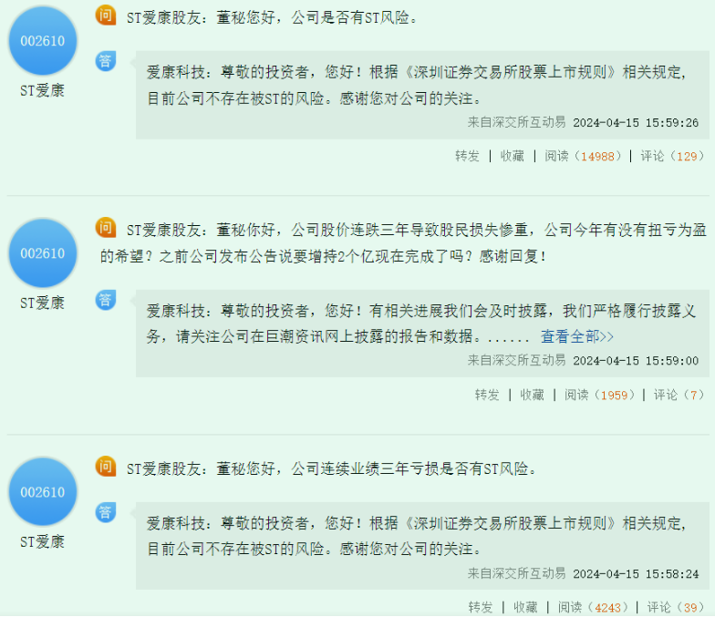 匪夷所思的是,4月15日,亲自担任公司董秘的ST爱康创始人邹承慧此前信誓旦旦向投资者保证,公司不存在ST的风险。这种公开扯谎,也是活久见。