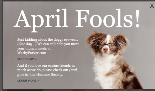 2012年4月1日,眼镜公司沃比帕克宣布,眼镜店的狗眼镜和人用眼镜一样太昂贵了,所以他们要开始售卖狗眼镜——沃比巴克。