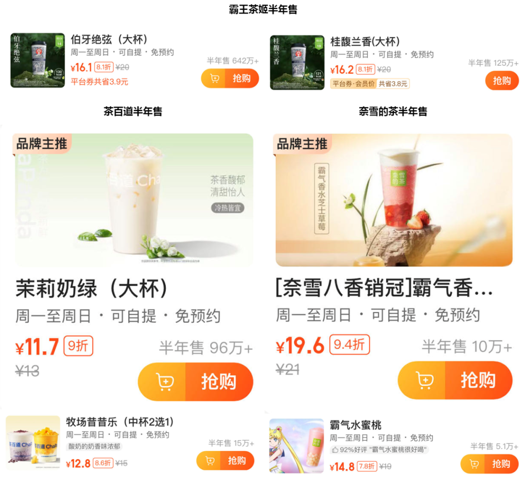 而奈雪的茶同期“半年售”数据显示,“霸气香水芝士草莓”超10万,“霸气水蜜桃”为5.1万。