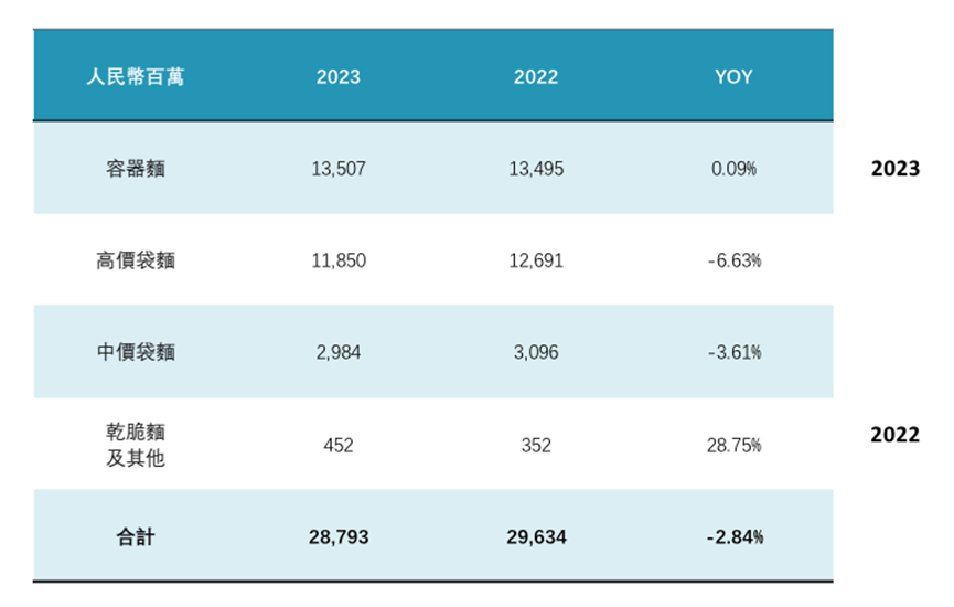 然而,遗憾的是,高价面并未俘获更多消费者。财报显示,2023年,康师傅高价袋面以及中价袋面营收分别为118.5亿元以及29.84亿元,分别同比下滑6.63%以及3.61%。