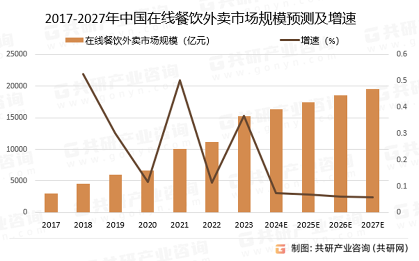共研产业咨询披露的数据显示,2023年,中国在线餐饮外卖市场规模达15254亿元。对比而言,2017年相关市场规模不足5000亿元,六年时间翻了超三倍。