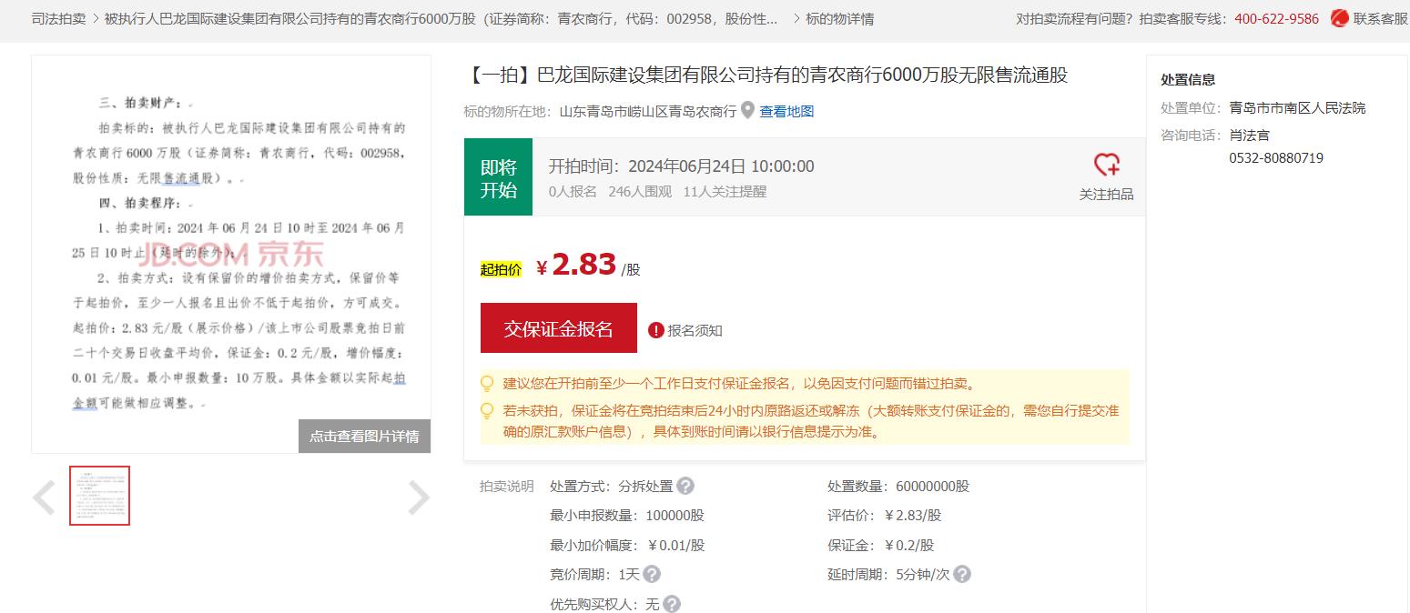 - 2023年12月16日,巴龙集团所持青农商行3400万股份再次被“摆上货架”。此次拍卖引来超9000人围观,共45人报名,最终以8719.10万元成交,成交单价较前一日收盘价折价约3.03%。