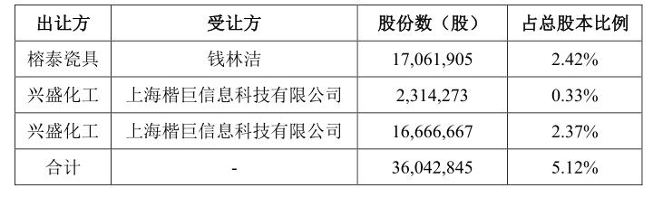 - 2023年12月27日,*ST榕泰发布公告称,经公司查询阿里资产司法拍卖网站及公司持股5%以上股东每日持股变化名单,上海楷巨受让兴盛化工此前持有的1898.10万股股份,占总股本的2.70%。
