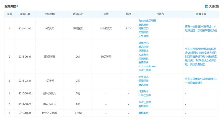 自2013年至2021年,小红书的所属企业行吟信息科技(上海)有限公司累计进行了6轮融资,投资阵容包括腾讯、天图投资、阿里巴巴、淡马锡等商业巨头,融资金额从数百万元逐渐剧增至数亿美元,而最近一轮的投后估值也达到了惊人的200亿美元。但是由于IPO前景不明,估值缩水的同时,融资难度也越来越大。