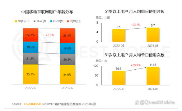 同时,老年受众的规模确实在与日俱增,越来越多的老年人将追剧、追综艺作为精神文化生活的一部分。根据QuestMobile发布的《2023中国移动互联网半年大报告》,截至2023年6月,移动互联网月活用户中银发人群持续增长,51岁以上用户人群占比已经达到26.4%。此次调查也发现,部分中老年人每天的追剧时长不减反增,除了在电视上观看外,还会通过手机、电脑、平板、短视频平台追剧。